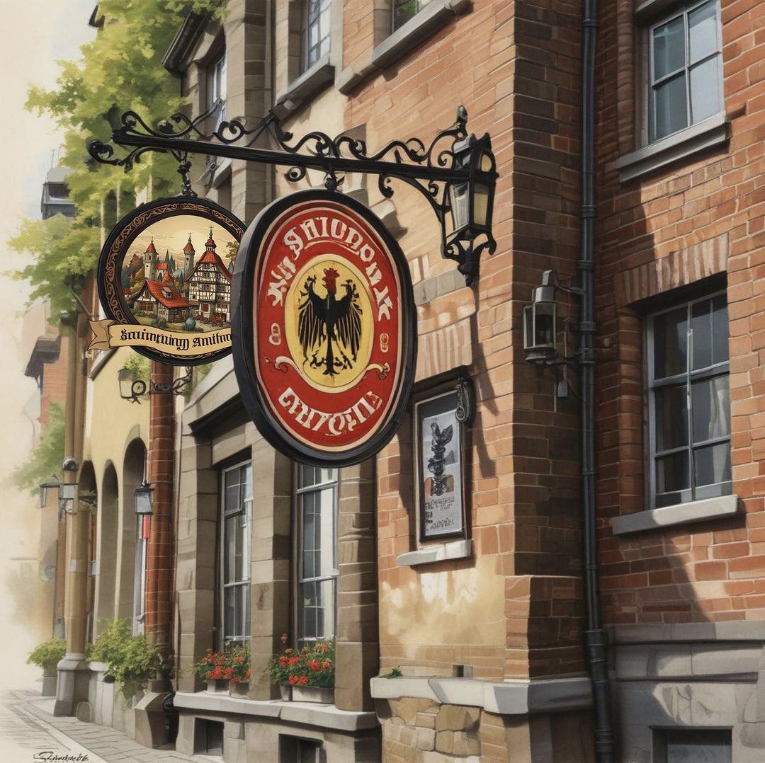 Historically, these signs were used by guilds to identify trades and services in medieval towns, often featuring symbols that represented the craft or trade.