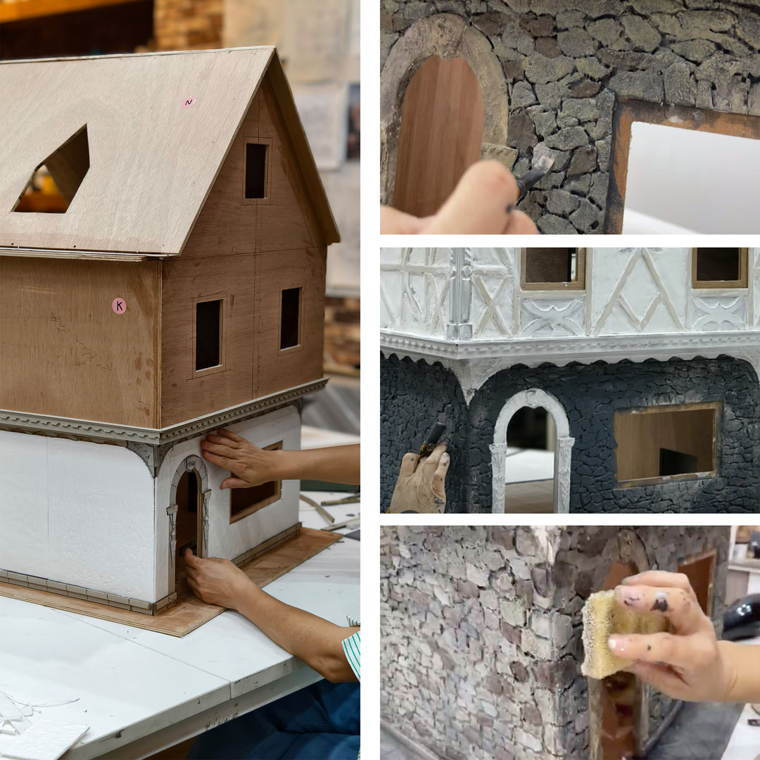 The design begins with a solid stone base for the first floor, providing a sturdy foundation that not only enhances the authenticity of your dollhouse but also serves as a canvas for your artistic expression. You will master the art of creating realistic stone textures, learning how to paint the walls to reflect the natural colors and textures of real stones—all in miniature form.