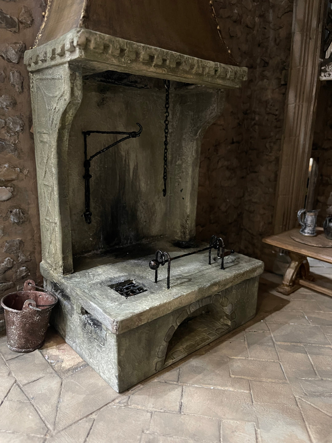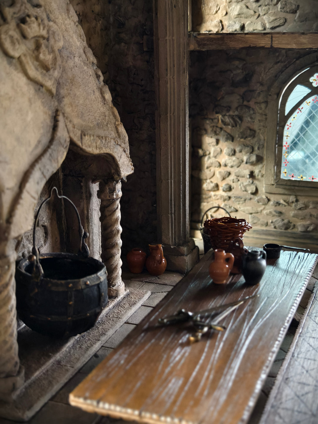The castle also boasts a spacious kitchen, complete with a large fireplace and essential furniture for food preparation.