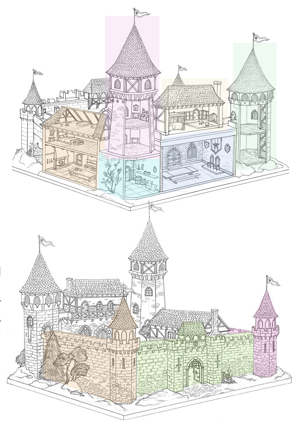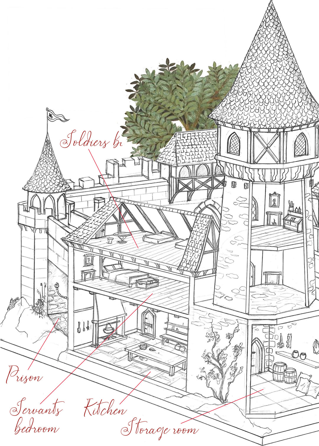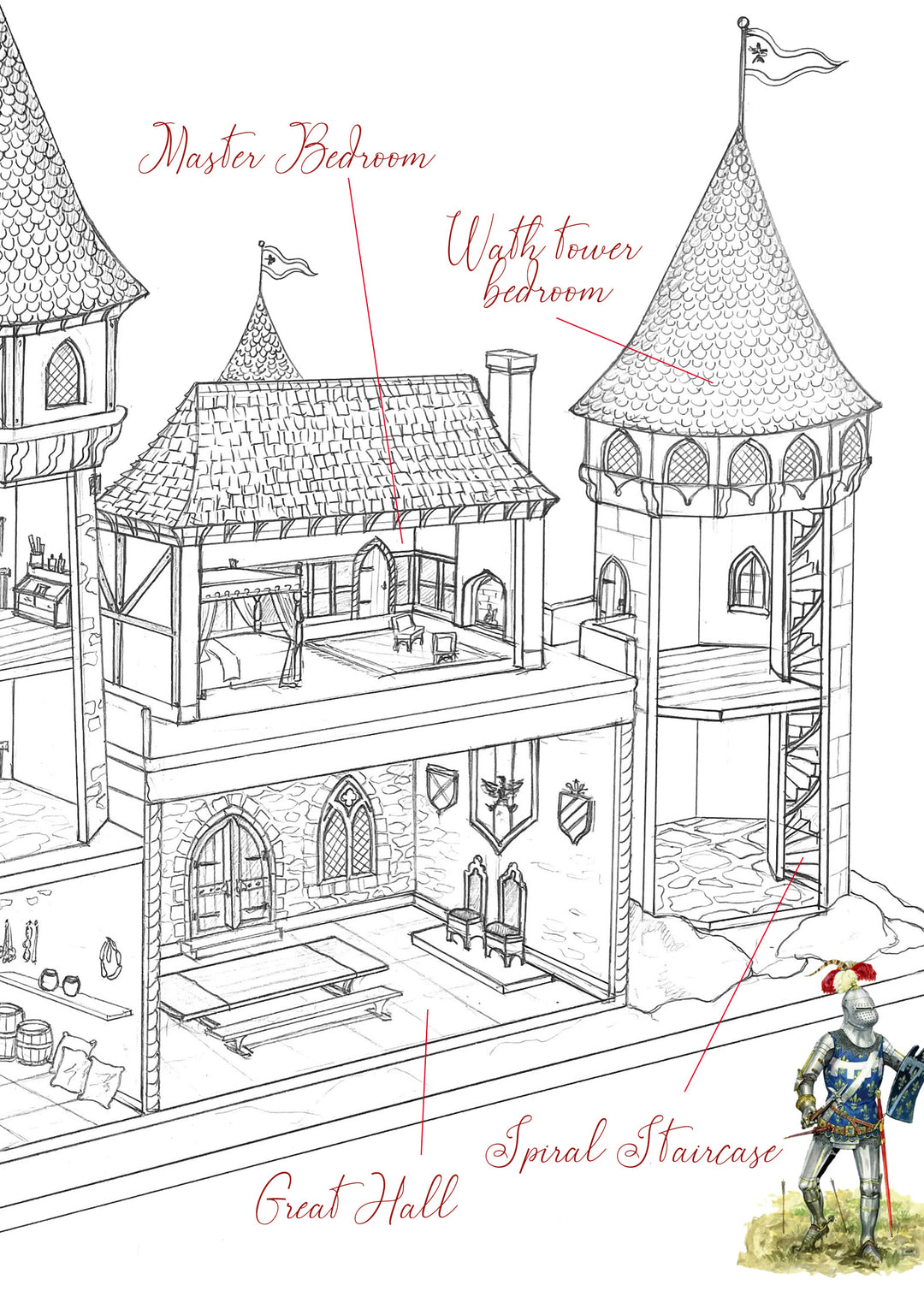 The two main towers of the castle feature classic medieval spiral staircases. Each tower is divided into various levels that can serve as bedrooms, studios, or weapon storage.