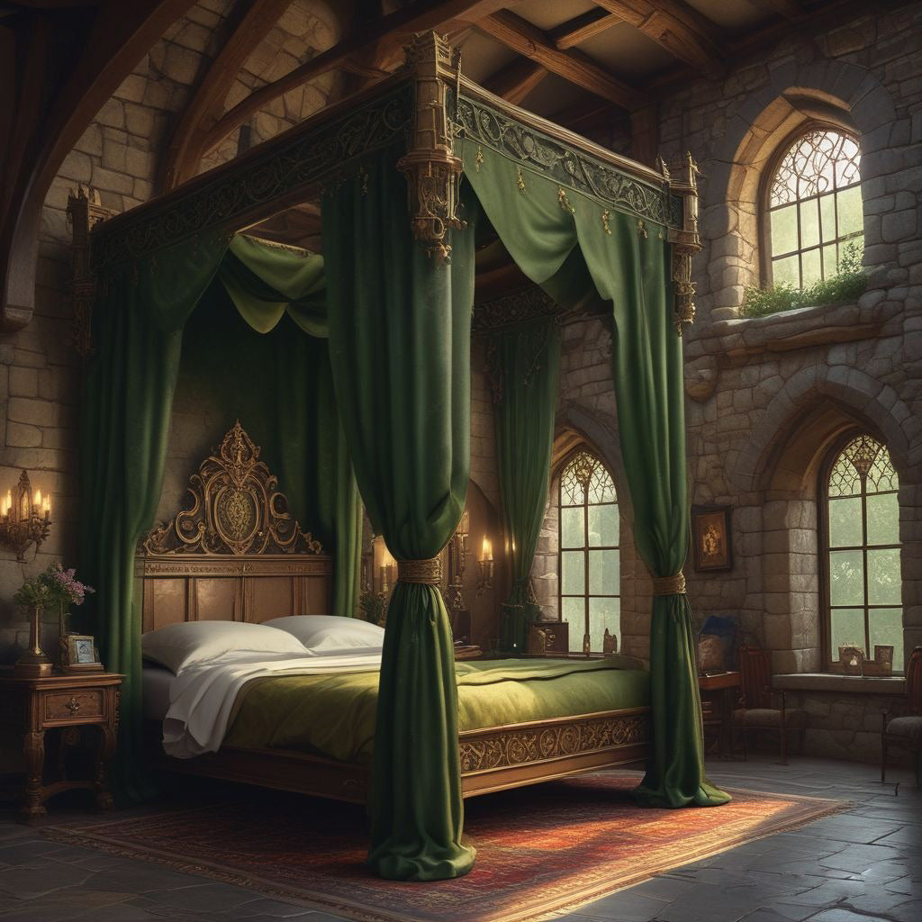 Directly above the Great Hall is the Master Bedroom, which will be adorned with vibrant, hand-painted medieval ornaments. Its walls will feature dark wooden panels in a Gothic style.