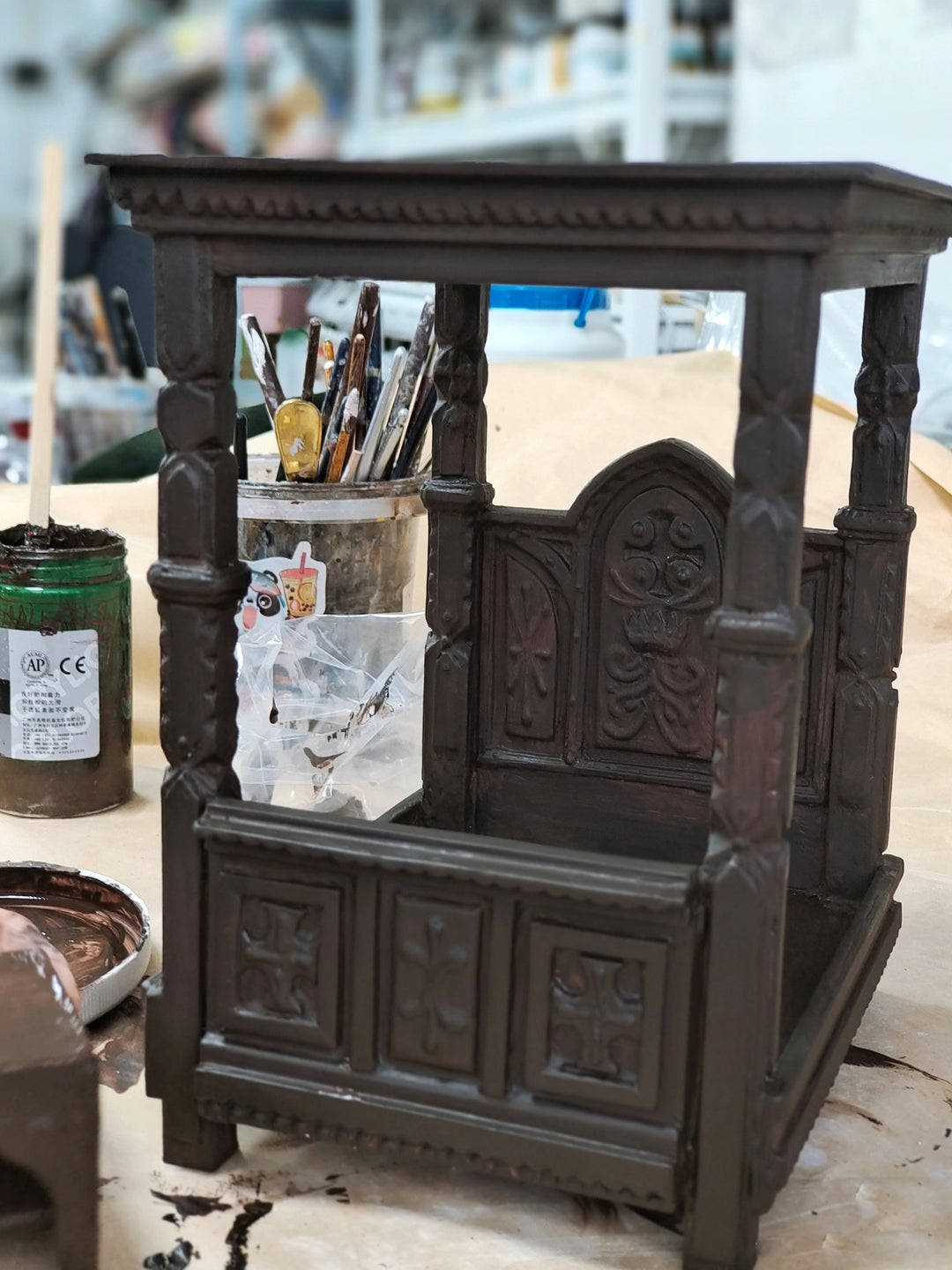 The room will be furnished with a royal velvet canopy bed and additional small furnishings, all in keeping with the Gothic aesthetic.