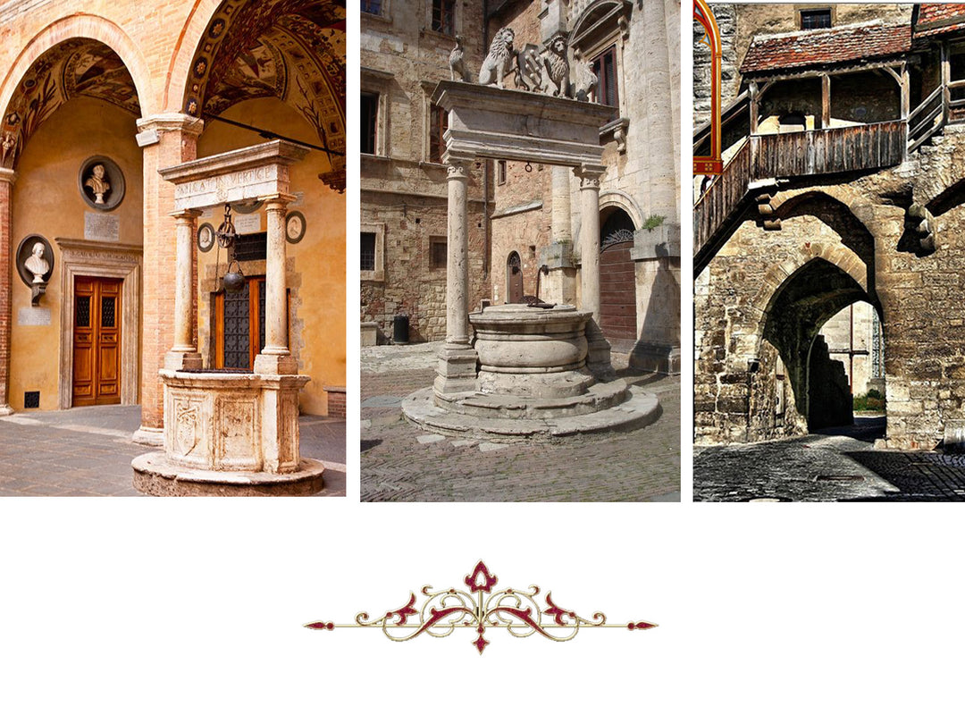 This section features numerous architectural details, including external wooden stairs attached to the walls and a charming well that would have supplied water to the castle.