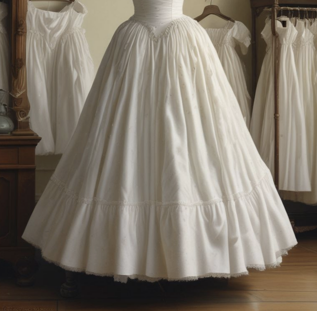 A skirt worn underneath the main dress, often layered to add volume and shape. Petticoats could be made from various fabrics and were sometimes decorated.
