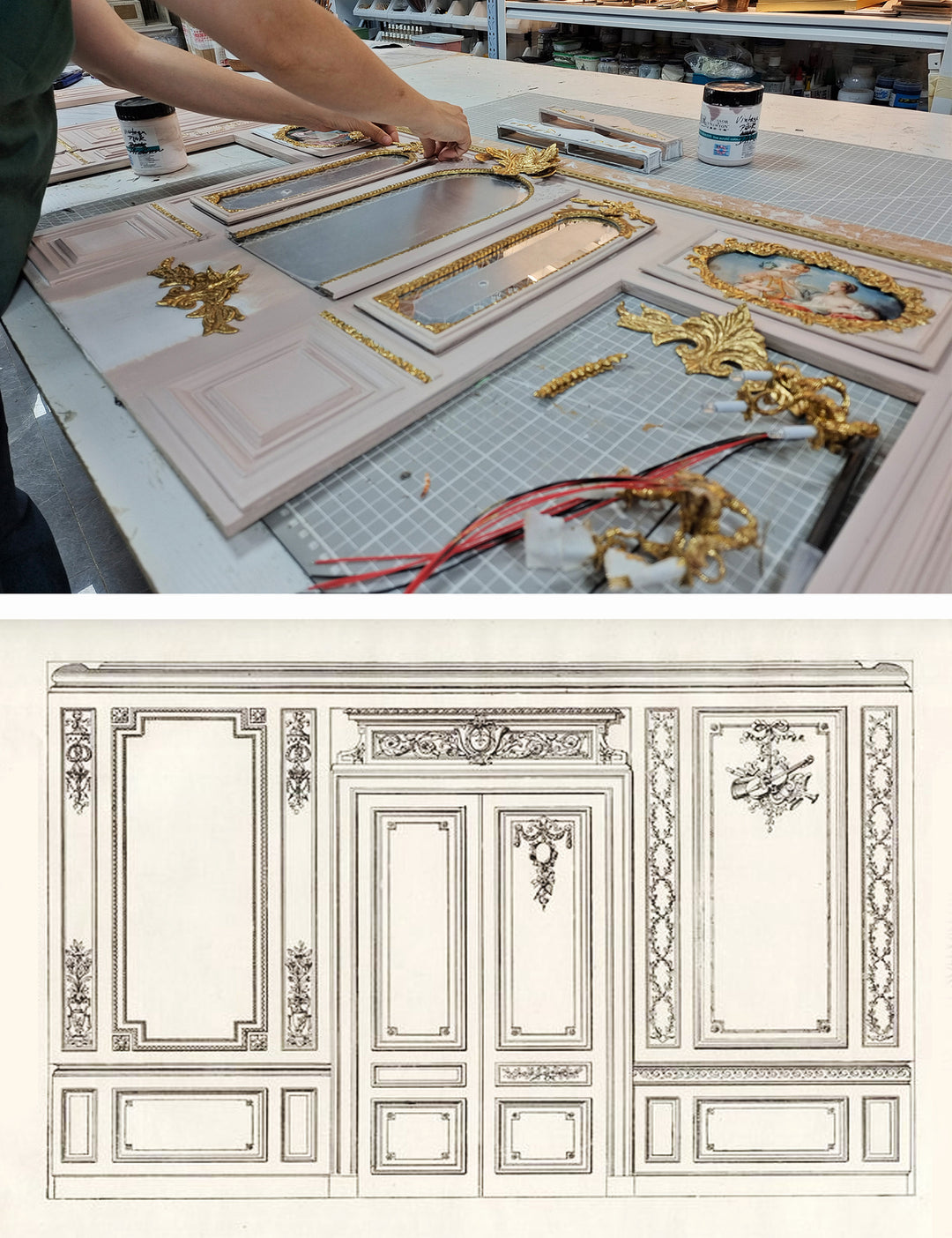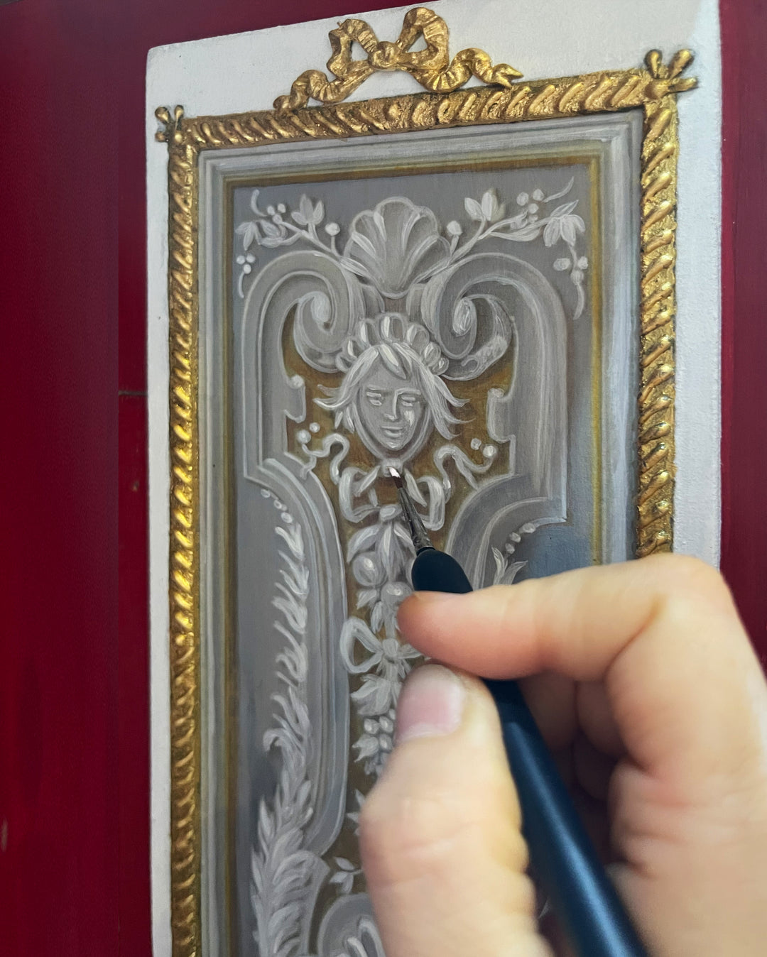 This salon has two double doors in pure rococo style. You will learn to design and decorate each door with intricate relief motifs and hand-painted details.