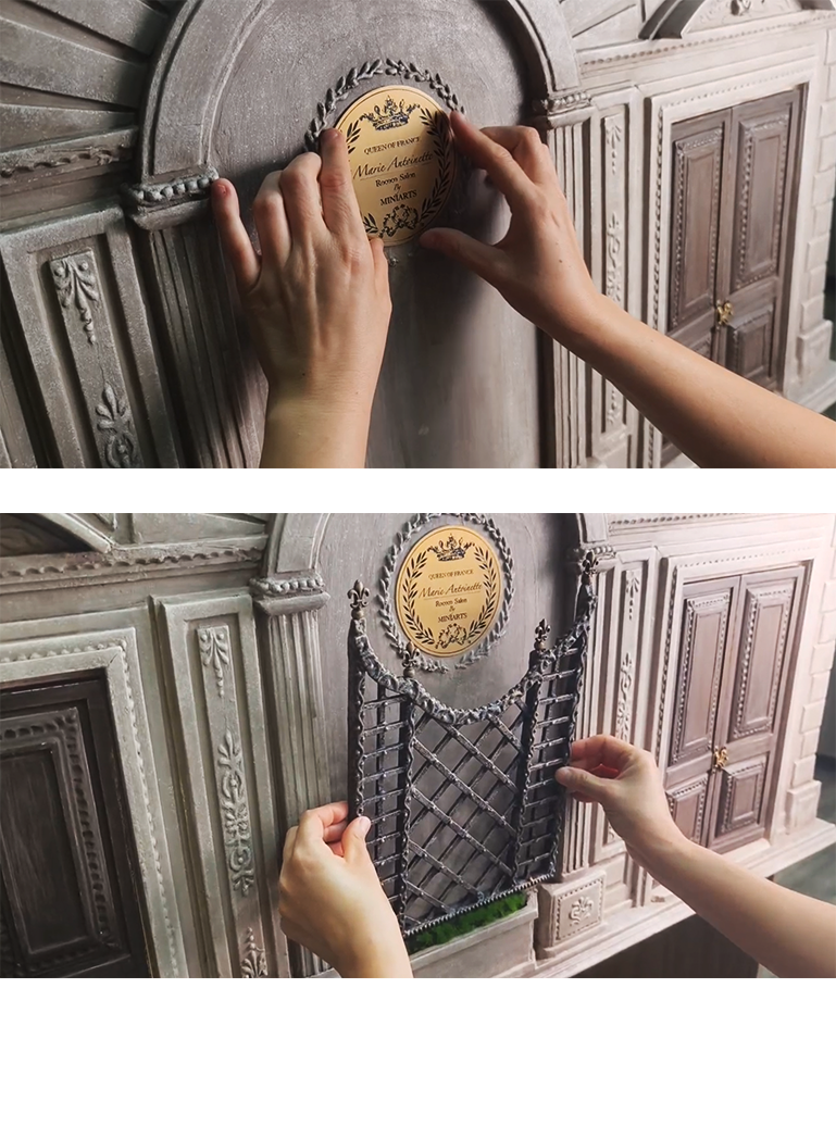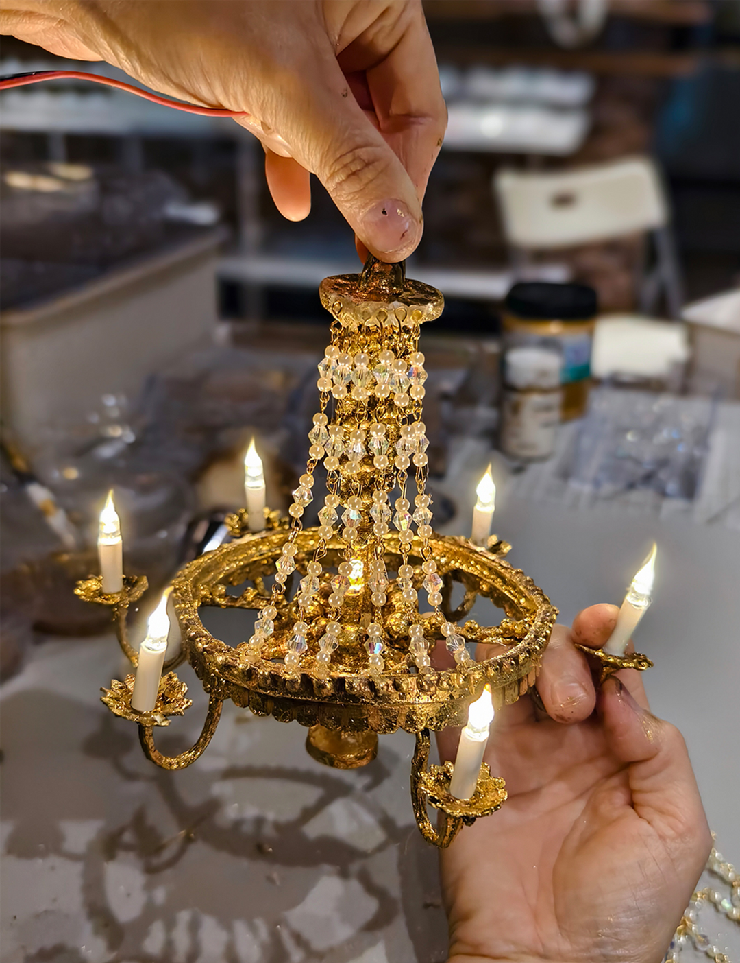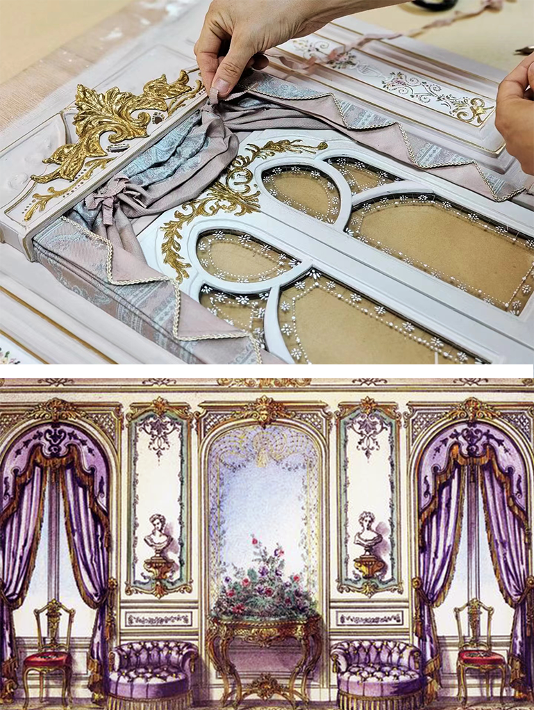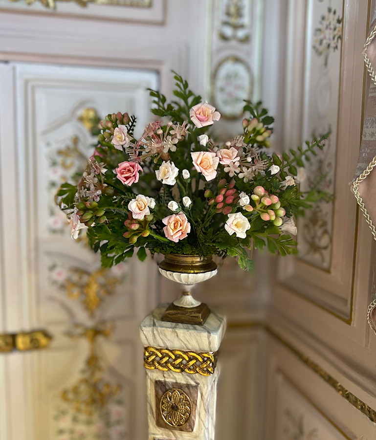 Beautiful, lifelike roses will adorn the trellis on the façade of this Rococo-inspired salon. As part of the course, you will learn the intricate techniques required to create realistic-looking miniature roses. This skillset will enable you to craft delicate flower arrangements to embellish the interior spaces, as well as climbing rose vines that will cascade gracefully over the exterior trellis.